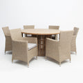Complete with the Carella table and six Amani dining chairs in driftwood wicker and stone cushions, the Carella/Amani is perfect for large family gatherings and with its neutral tones is sure to place well in any outdoor space.
