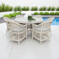 The included table has been topped with a thick piece of tempered glass for added strength and durability. The bottom half of the table is beautifully detailed and finished with the same wicker weave as each of the chairs.