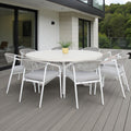 Aluminium built, with a white powder coating, the Octavia chair is light in weight and strong in design. A beautifully, well thought out chair, the Octavia comes complete with rope detailing on the upper half of the chair, timber look, polywood panels on each of the chair arms and a light grey coloured, padded base cushion for extra comfort and support. The Octavia is also stackable making storing away a simple task.