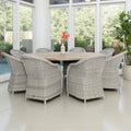 The included 8 Portland chairs are spacious in size providing enough space to sit back and relax in total comfort. The rounded frame edges complement the rounded edges of the Oscar table. Built using a powder coated aluminium frame, covered with a UV treated, weather resistant rattan, the Portland has been built to last. The grey wicker weave displays beautiful earthy tones which will work well in any existing space. Each Portland chair also comes complete with a higher back and a charcoal, polyester, base cushion for added comfort and support.