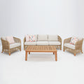 The included coffee table also features the same acacia frame, along with narrow paneling and post legs.