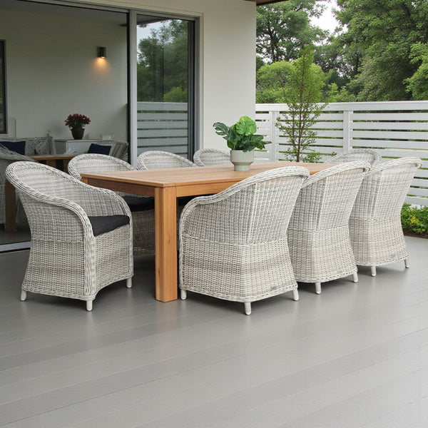 Complete with a 220cm post leg timber table and eight Portland dining chairs, the Selina-Portland will become a stylish, yet practical inclusion to any garden space.
