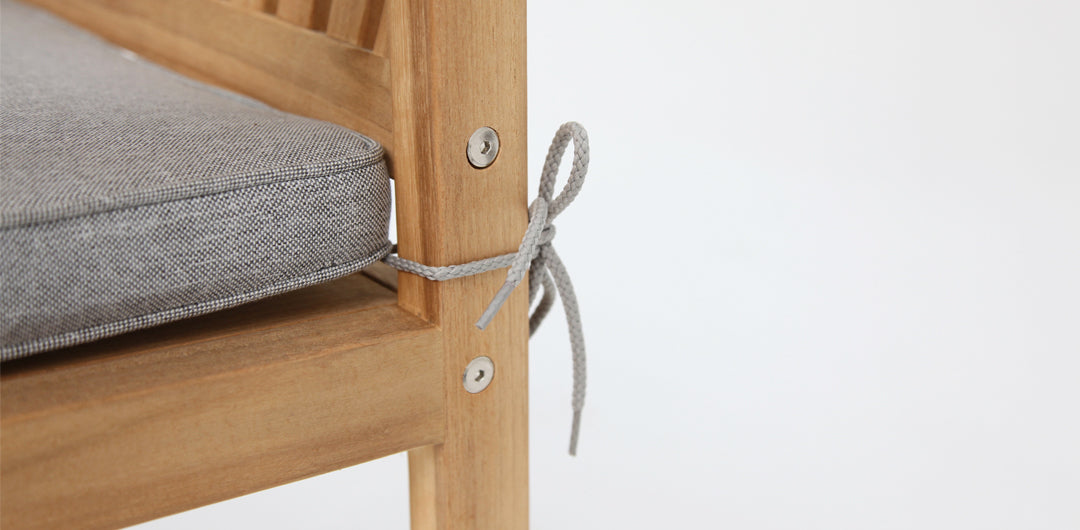 The included light grey base cushions are weather resistant, and can be used outdoors, however we do recommend to bring them indoors or place in a cushion box when not in use to prolong the life of the fabric. The tie detail on either side of the cushions adds a nice touch allowing the cushion to stay in place whilst in use.