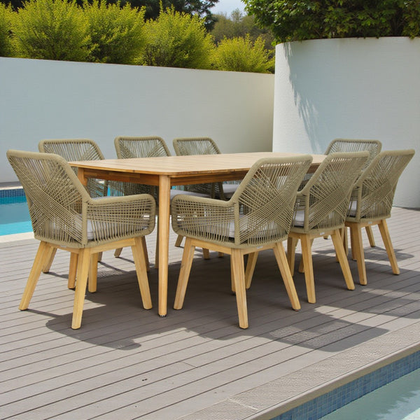 This 9 piece, durable, outdoor set comes complete with a Versailles 215cm timber table, along with 8 Albenga dining chairs in either black or taupe.