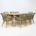 This 9 piece, durable, outdoor set comes complete with a Versailles 215cm timber table, along with 8 Albenga dining chairs in either black or taupe.