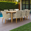 This 9 piece, durable, outdoor set comes complete with a Versailles 215cm timber table, along with 8 Faro dining chairs in either kobo grey or white natural.