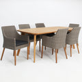 This 7 piece, durable, outdoor set comes complete with a large, rectangular Weston table, along with 6 Faro dining chairs in a kobo grey.