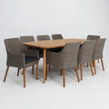 This 9 piece, durable, outdoor set comes complete with a large, rectangular Weston table, along with 8 Faro dining chairs in a kobo grey.